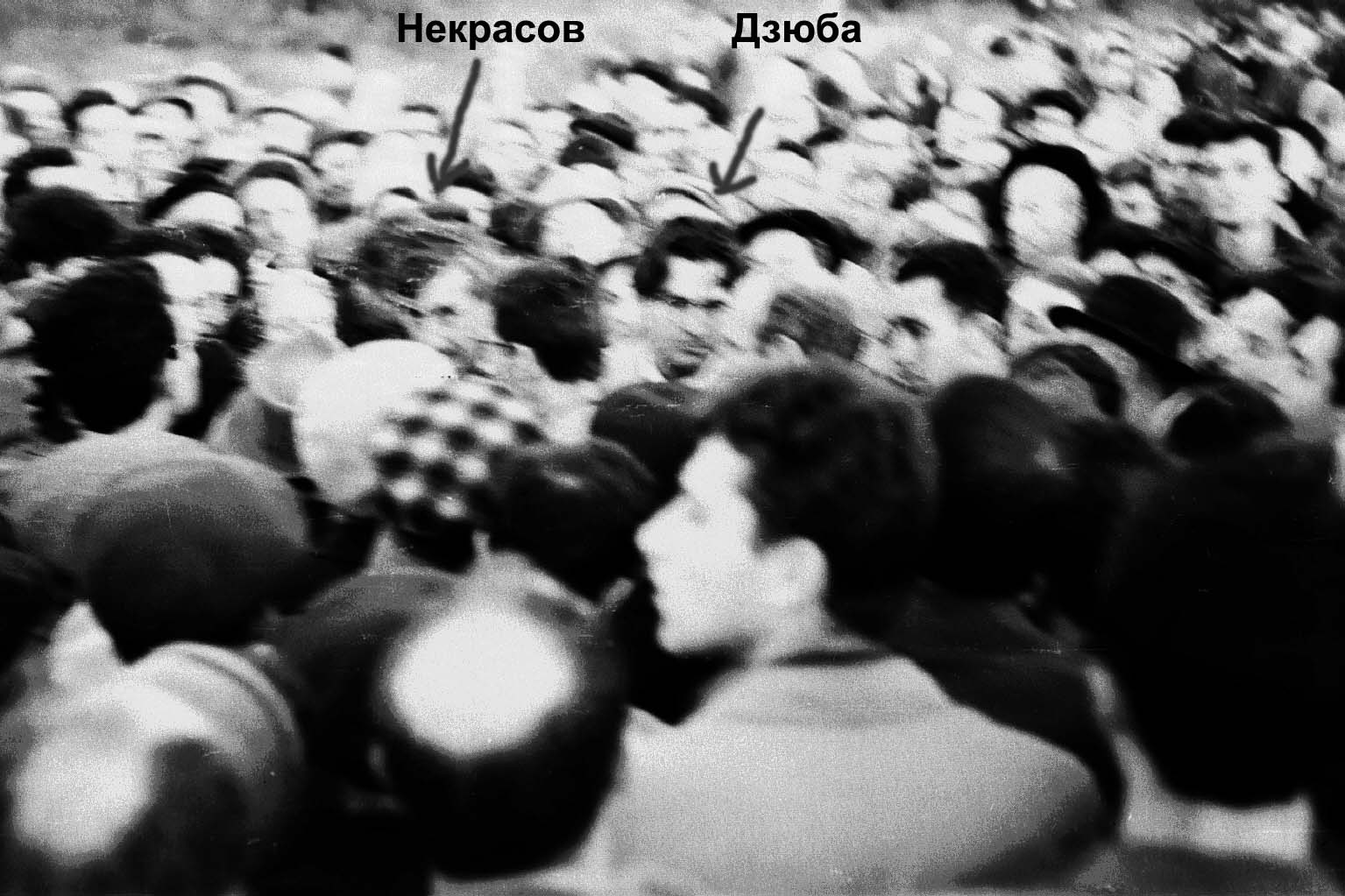 В народной памяти центральными событиями на митинге 29.09.66 года были выступления В. П. Некрасова и И. М. Дзюбы. А вот как это выглядело на самом деле – зажатые в толпе, без каких-либо технических средств (без микрофонов и усилителей), едва слышимые в ближайшем окружении, говорили они тогда, но эхо сказанного ими в тот день, звучит и слышно даже сегодня, даже на расстоянии в 50 лет.