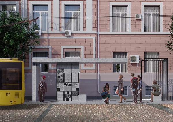 Несущей конструкции остановки из бетона придана форма модульной сетки газеты. На ней — избранная информация по делу Бейлиса, цитаты, фото, прямая речь экспертов и т.п. Некоторые плоскости оставлены пустыми — вспомните ромские погромы 2017 — 2018 годов в Киеве, Одессе, Львове и Тернополе — они тоже могут найти свое место в истории ненависти и предубеждений, и частично отражены на стендах инсталляции.