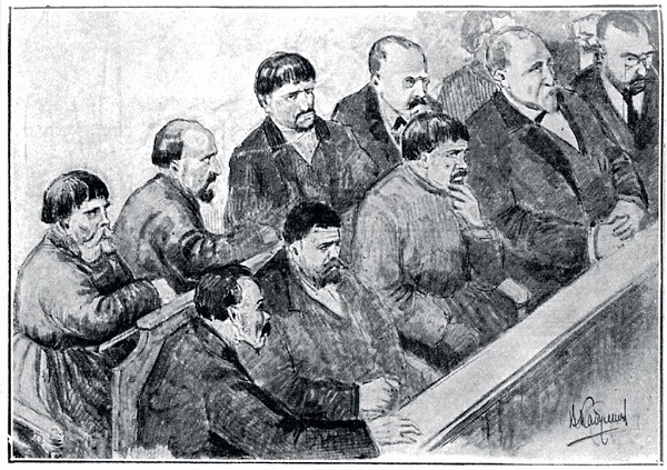 В такой атмосфере готовился суд над приказчиком, и «лучшим людям страны» была отведена в этом фарсе особая роль. Как правило, суд присяжных формировался в основном из дворян, купцов и разночинский интеллигенции, но на этот раз рисковать было нельзя, поэтому обвинение сделало ставку на самые темные слои российского общества. Из 12-ти присяжных пятеро, включая старшину, состояли в «Союзе русского народа», органом которого и являлось погромное «Русское знамя». Несколько крестьян, извозчик, сотрудник почты, мелкий чиновник, служащий вокзала, контролер трамвая, работник винного склада — эти люди не могли ошибиться, поддержав идеологически правильный и освященный свыше вердикт. Но даже они не взяли грех на душу, слишком уж белыми нитками было шито обвинение, слишком очевидной была ложь свидетелей, терпеливо разоблачаемая  защитой.